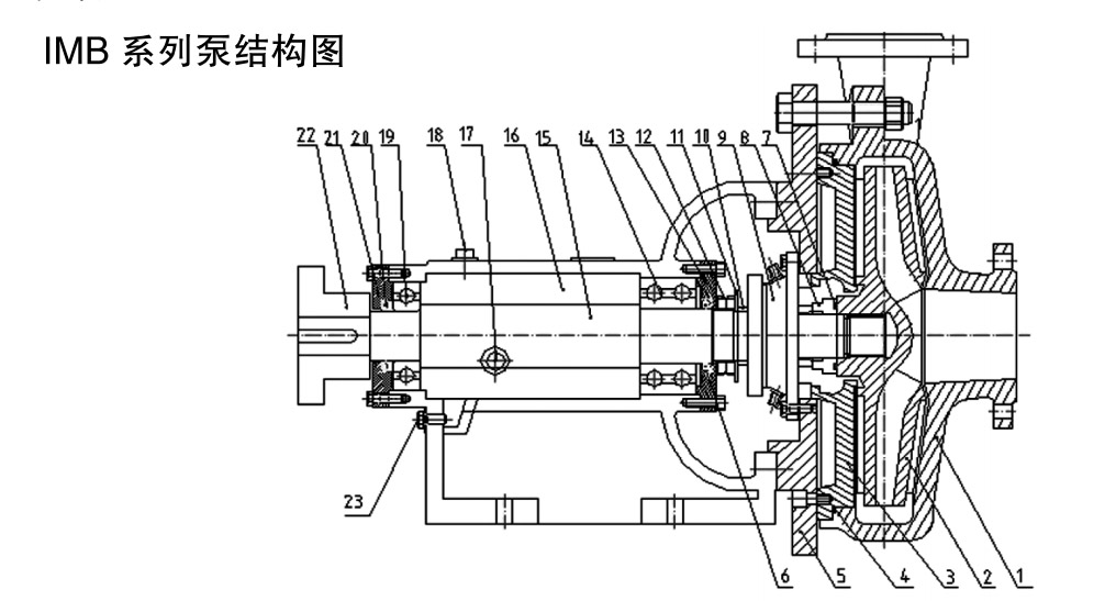 IMB 系列泵由泵体叶轮泵盖托架机械密封等组成,结构上有前开式和后开式之分。