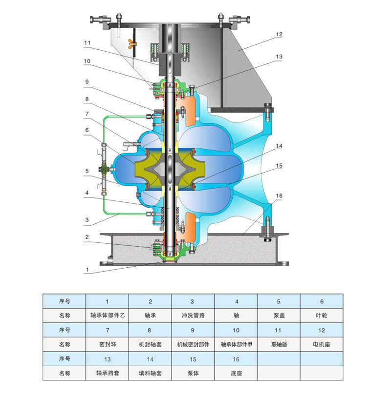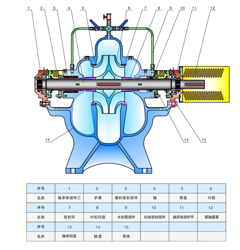 泵轴由两个单列向心球轴承支承,轴承装在泵体两端的轴承体内,用黄油润滑,双吸密封环用以减少水泵压水室的水漏回吸水室。