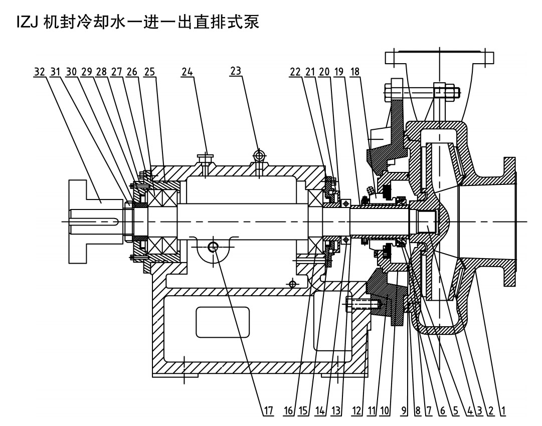 1、泵体 2、叶轮 3、主轴 4、动环座O型圈 5、动环座 6、泵盖 7、13轴套O型圈 8、泵体O型圈 9、机封函体O型圈 10、机封函体 11、夹板 12、托架 14、折卸盆 15、29油封 16、圆柱轴承 17、油镜 18、机械密封 19、轴套 20、挡水盆O型圈 21、挡水盆 22、油封压盖 23、吊环 24、注油螺母 25、轴承箱0箱圈 26、角接球轴承 27、轴承箱 28、轴承压盖 30、轴承挡套 31、挡套拼帽 32、泵联